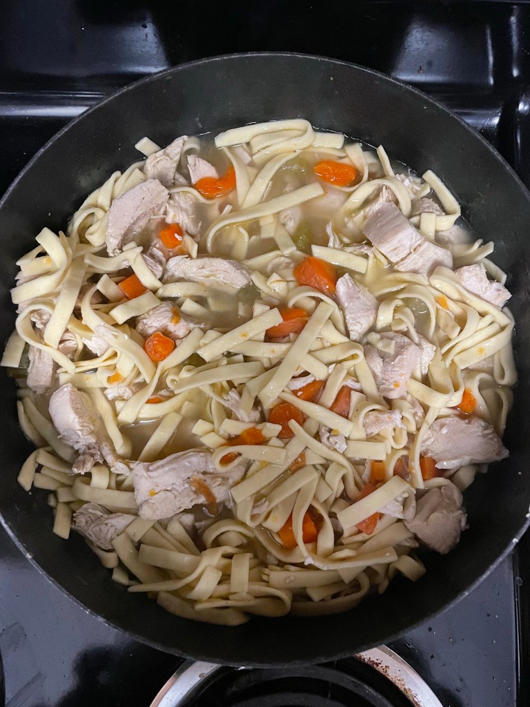 Cook noodles. Remove chicken from broth; cool slightly. Remove chicken from bones and skin. Cut chicken into 1-inch pieces. Add chicken and noodles to broth; heat until hot, about 5 minutes.